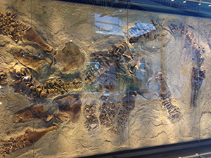The highlight here is the unparalleled exhibition of a plesiosaur with its unborn child. “This was the first example of live birth in a plesiosaur,” Walsh explains and points out the adult fossil from the fetus. They have no evidence of predation on them, no teeth marks, and are in the abdominal cavity, which suggests that it was a fetus.