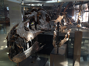 This is also true for the tyrannosaurus exhibition, which includes a baby, a juvenile and a sub-adult specimen, but the preserved remains of their real skulls are also put in display in a separate glass case.